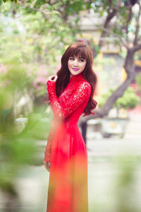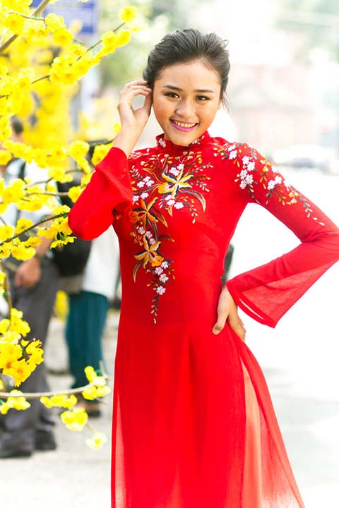 Áo dài đỏ được cho là mang lại nhiều may mắn trong những ngày đầu năm. Một chiếc áo dài đỏ thêu hoa hoặc áo dài đỏ nhung tôn lên vẻ đằm thắm và mặn mà của người con gái Việt. Áo dài ôm sát, tôn lên những đường cong của phái nữ, kín đáo nhưng quyến rũ không kém những bộ váy hiện đại.