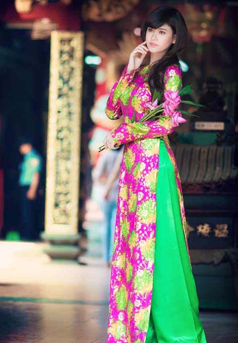 Áo dài hoa cách điệu được nhiều bạn gái lựa chọn mặc trong những ngày đầu năm, vừa dịu dàng êm ả nhưng vẫn đầy tươi tắn. Áo dài hoa có nhiều mẫu mã và sắc tố cách điệu tương thích với lễ chùa