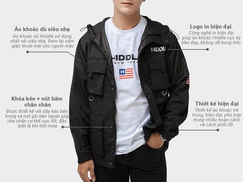– Bên cạnh đó, Hiddle còn tinh xảo khi phong cách thiết kế phần nút gài ở bên ngoài và khóa kéo ở bên trong, giúp che chắn khung hình của người mặc một cách tốt nhất, đặt biệt vào trời mưa .