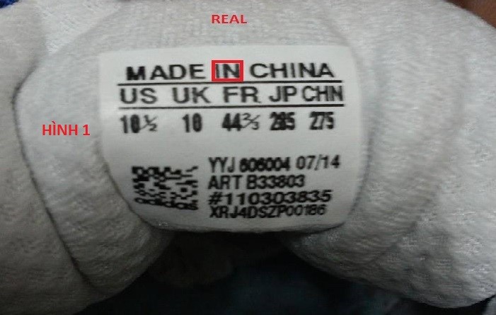 Font chữ tem giày chính hãng khi nào cũng sắc nét, rõ ràng hơn tem giày fake. Khoảng cách giữa “ US UK FR JP CHN ” của giày chính hãng có sự độc lạ, khoảng cách của “ US UK FR JP ” thì bằng nhau nhưng khoảng cách của “ JP CHN ” ngắn hơn khoảng cách trên. Còn với giày fake thì khoảng cách “ US UK FR JP CHN ” đều bằng nhau .