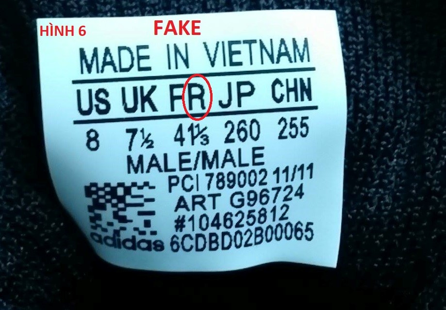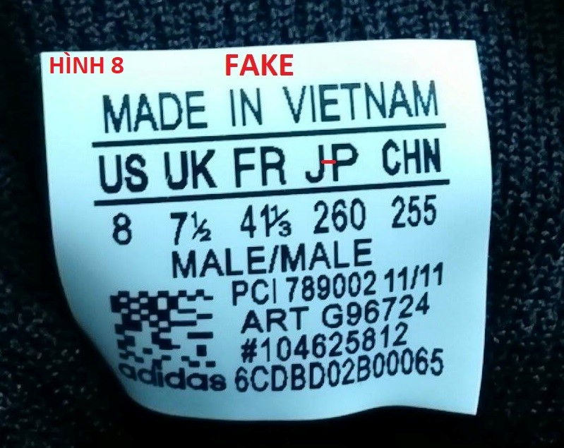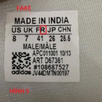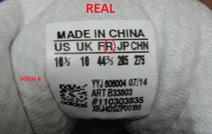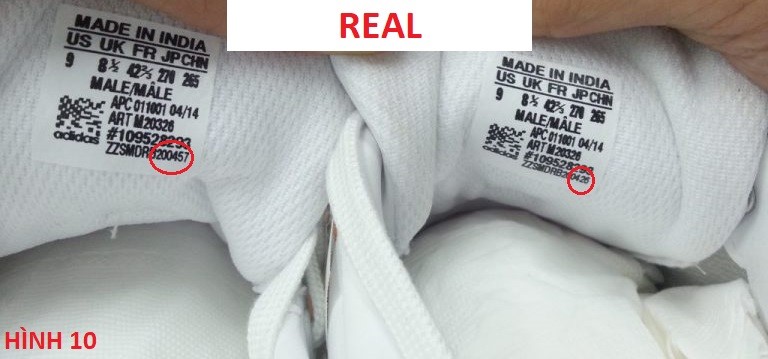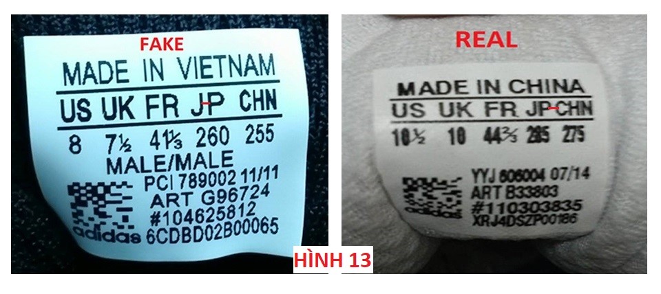 Adidas lao lý mỗi thành phần của mẫu sản phẩm sẽ có 1 mã khác nhau, do đó giày Adidas có mã cho chiếc bên trái và chiếc bên phải ( hình 10 ). Còn với giày fake, do sản xuất tem hàng loạt nên mã thành phần của 2 chiếc giày trái và giày phải sẽ giống nhau trọn vẹn ( hình 11 ) .