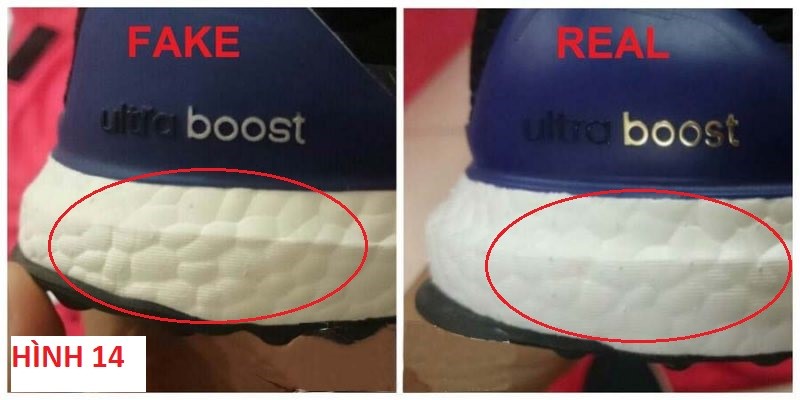 Mật độ hạt của đế Boost fake ít và phân bổ không đều, còn của đế xịn sẽ được sắp xếp thẳng hàng với nhau ( hình 14 ). Ngoài ra về độ êm ái và thật chân thì giày fake vẫn còn 1 khoảng cách so với giày chính hãng. Nhưng để phát hiện ra điều này là điều khá khó khăn vất vả .