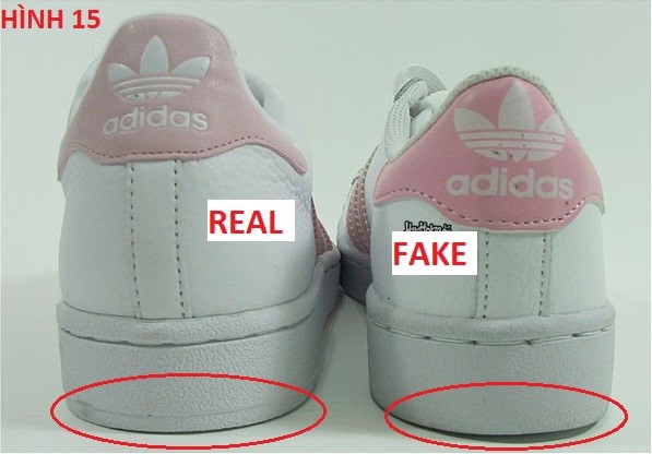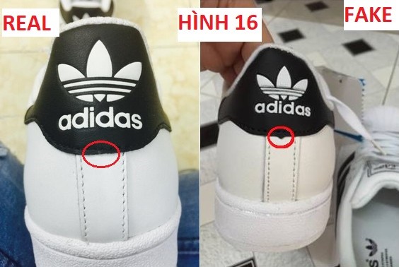 Ở giày Adidas nói chung, phần da được may thêm phía sau gót giày luôn được cắt rất nuột nà và trơn tru. Trong khi đó, phần da này ở giày fake lại bị một lỗi rất đặc trưng đó là một mẩu thừa nho nhỏ ở chính giữa ( hình 16 ) .