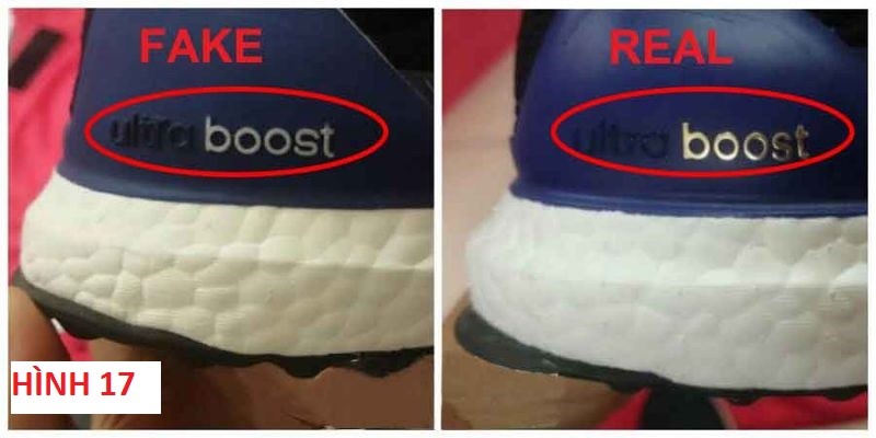 Như trong hình 17, dòng chữ “ ultra boost ” của giày xịn rất đều, chữ “ boost ” được mạ vàng sáng bóng. Với giày fake, chữ “ r ” trong “ ultra ” được đẩy cao lên ngang với chữ “ t ”, chữ “ s ” trong “ boost ” bị méo, và chữ “ boost ” mạ vàng nhưng bị xỉn, không có độ bóng. Đây là những chi tiết cụ thể rất nhỏ nhưng nếu chú ý hoàn toàn có thể nhận biết được giày fake thuận tiện .