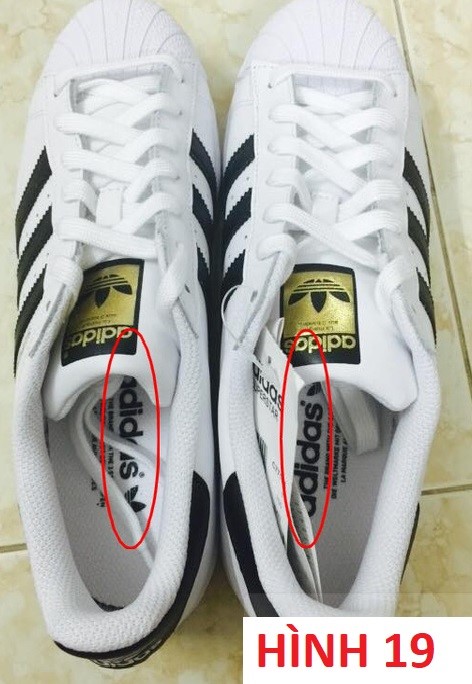 Ở giày xịn, phần lót giày sẽ được dán rất chắc và cẩn trọng vào đế giày ( nếu đôi giày đó có miếng lót dán vào giày ) trong khi ở giày fake, lớp lót này thường được dán cẩu thả nên rất dễ bong tróc. Bên cạnh đó, chữ in trên lót giày real cũng luôn tinh tế và rõ nét hơn ở giày fake. Ngoài ra, Adidas có phương pháp in tên hãng lên lót giày khá đặc biệt quan trọng và bạn hoàn toàn có thể dựa vào đặc thù này để phần nào phân biệt giày xịn hay fake. Với một đôi giày Adidas hàng chuẩn, dòng chữ ” adidas ” in trên lót giày của hai chiếc giày trong cùng một đôi sẽ quay đầu vào nhau ( cùng hướng vào má trong của mỗi chiếc giày ) chứ không nằm cùng hướng ( hình 19 ). Giày Adidas xịn với tên hãng in trên lót giày ở hai chiếc giày ngược hướng nhau .