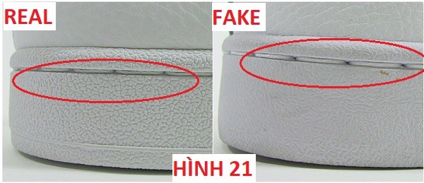 Đường chỉ may trên đôi real sẽ có độ tỉ mỉ, cẩn trọng hơn nhiều so với đường khâu tạm bợ và có phần “ lộn xộn ” trên đôi fake. Đôi real thường có đường chỉ may hình chữ X hoặc ô vuông ngay ngắn và xen kẽ nhau ( hình 20 )