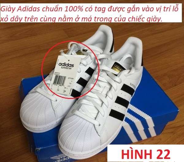 Chỉ bằng việc quan sát phương pháp đôi giày được gắn tag, bạn cũng hoàn toàn có thể phần nào chỉ ra được nó có phải hàng chuẩn hay không, nổi bật nhất là với các mẫu giày của Adidas. Một đôi giày Adidas xịn sẽ có phần tag được gắn vào lỗ xỏ dây giày trên cùng nằm ở má trong của một trong hai chiếc giày .