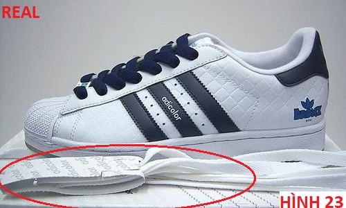 Nếu để ý kỹ, bạn sẽ thấy dây giày của Adidas chính hãng sẽ được bọc cẩn thận và chắc chắn với lớp nhựa trong không đục, và có đóng niêm phong ở mặt ngoài. Trong khi đó, những đôi giày giả, nhái thì không được cẩn thận như vậy, hầu hết được bọc qua loa, lỏng lẻo bằng thun hay một lớp giấy nilon, và không có tem chính hãng dán mặt ngoài.
