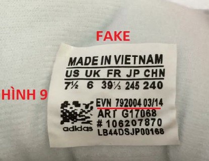 Adidas lao lý mỗi thành phần của mẫu sản phẩm sẽ có 1 mã khác nhau, do đó giày Adidas có mã cho chiếc bên trái và chiếc bên phải ( hình 10 ). Còn với giày fake, do sản xuất tem hàng loạt nên mã thành phần của 2 chiếc giày trái và giày phải sẽ giống nhau trọn vẹn ( hình 11 ) .