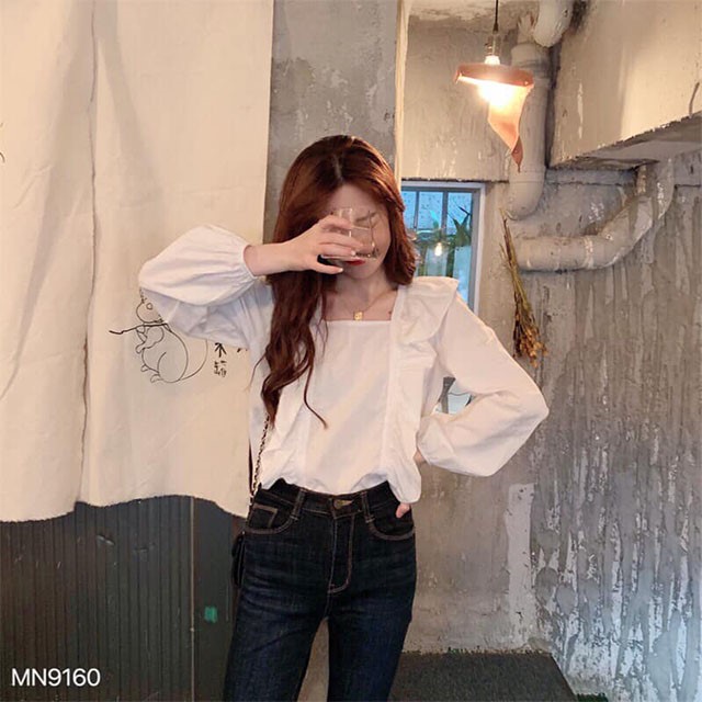 Sơ mi cổ chữ U có viền bèo tạo dọc