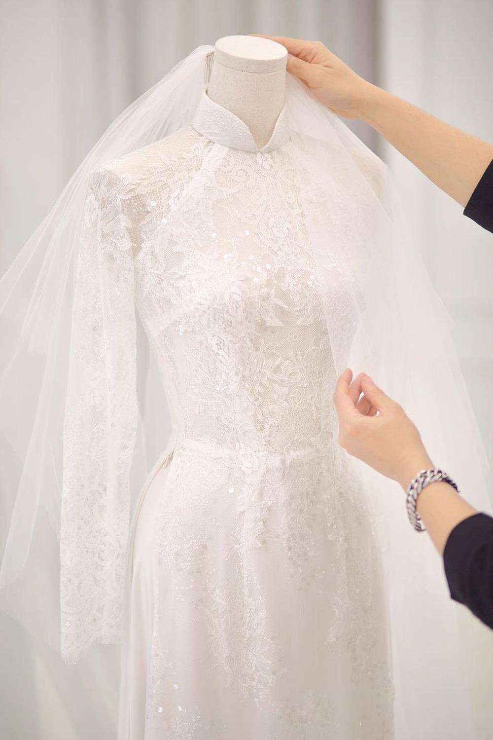 Chất liệu ren may Áo Dài cô dâu màu trắng có độ co dãn và hoạ tiết bắt mắt