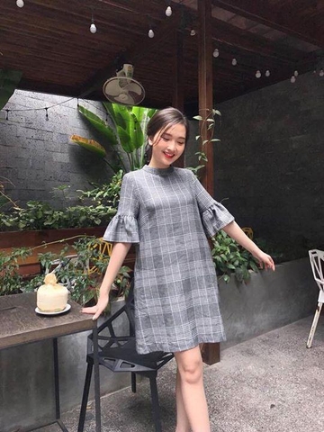 Đầm kẻ caro suông dáng trơn tạo điểm nhấn bèo nhún ở tay